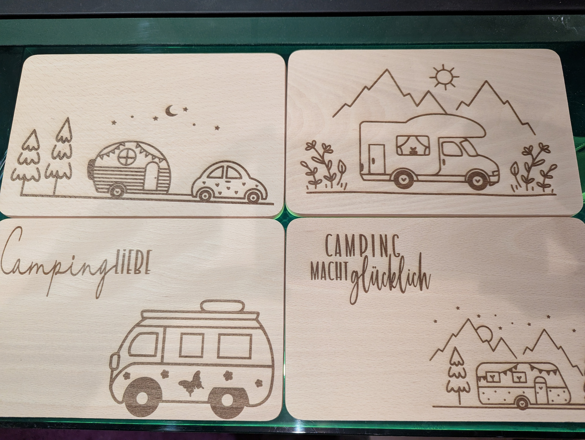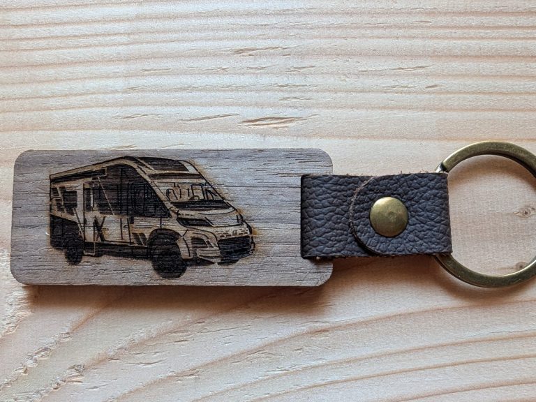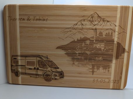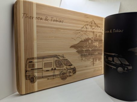 Das Wohnmobil des Brautpaares auf einem Holzbrett.